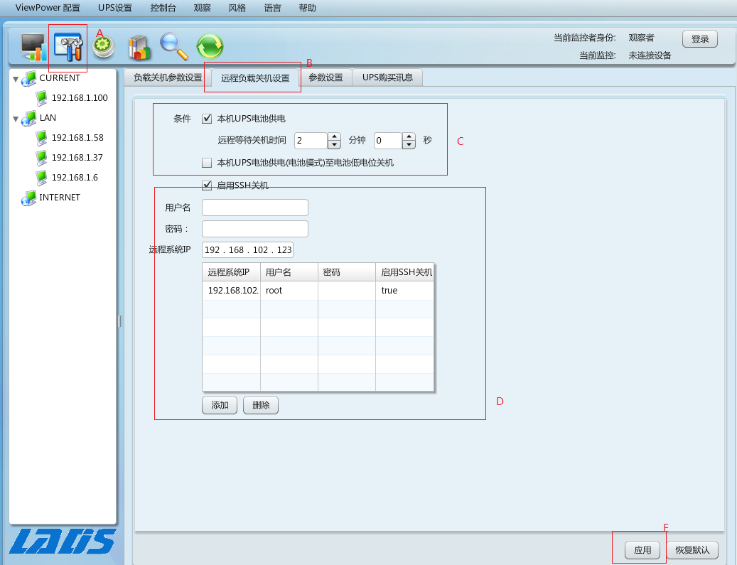 2、如果要在交流故障時關(guān)閉ESXi,請轉(zhuǎn)到UPS設(shè)置 》遠(yuǎn)程關(guān)機頁面,請參考A和B部分。然后選擇關(guān)機條件,并設(shè)置關(guān)機時間,參考C部分,并將ESXi服務(wù)器IP地址添加到IP列表,參考D.的部分。最后單擊“應(yīng)用”按鈕保存配置。